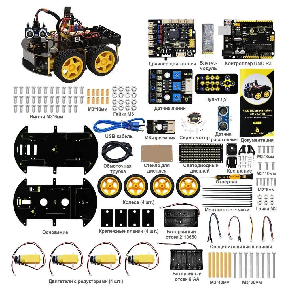 Набор для моделирования Ардуино (Arduino) 4WD BT Car V3.0 – это конструктор, при помощи которого можно собрать робот автомобиль. Комплект для моделирования подойдет взрослым и детям с разным уровнем владения навыками робототехники. В набор поставки включены микроконтроллер, датчики, модуль Bluetooth, приводы, провода, плата и другие комплектующие. Собранная на плате Ардуино машина способна передвигаться по заданной траектории, разворачиваться, двигаться с разной скоростью. Arduino Car Robot не нуждается в пайке – все элементы собираются и разбираются вручную. Контроллер поддерживает управление с пульта либо смартфона.